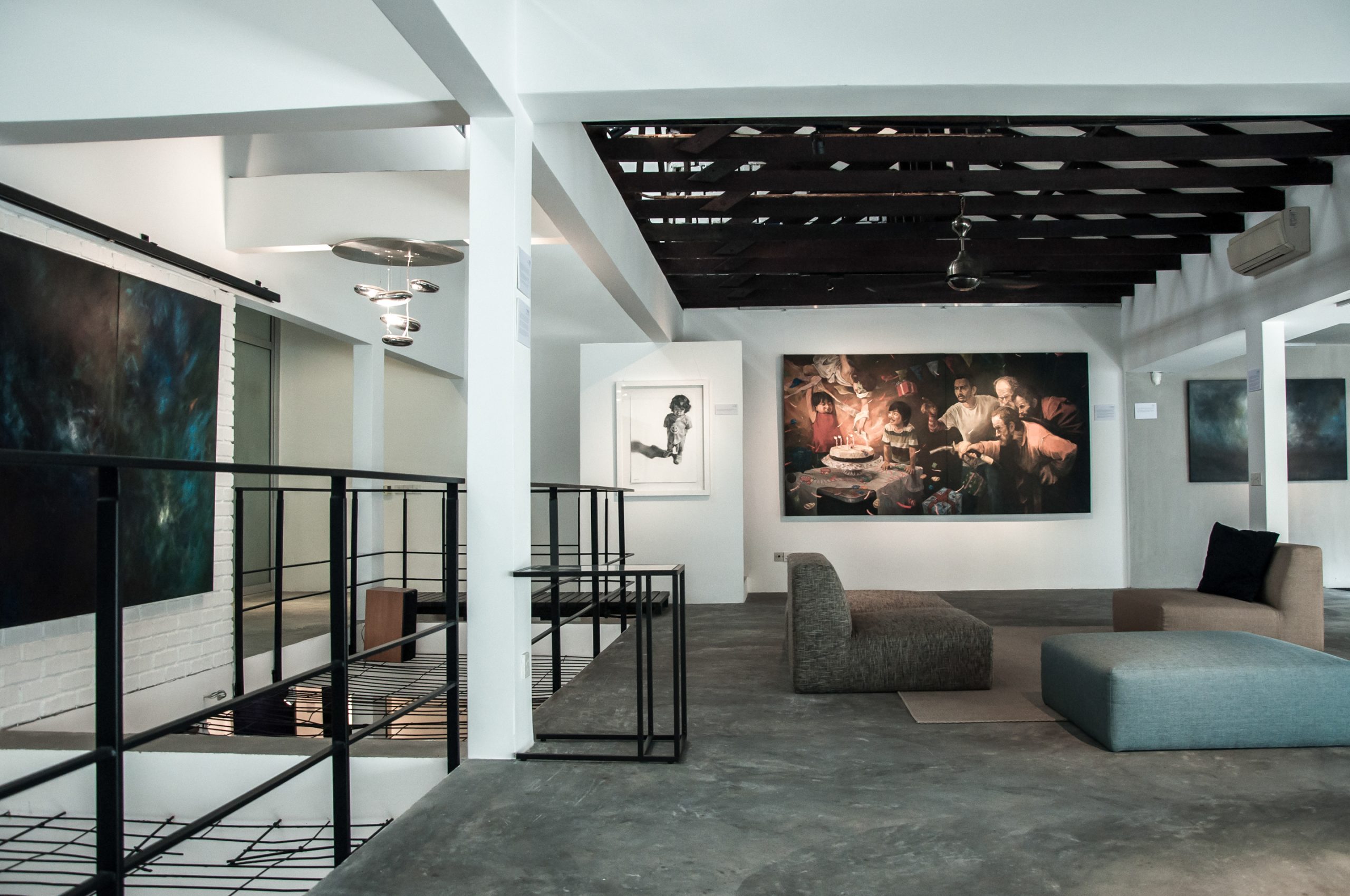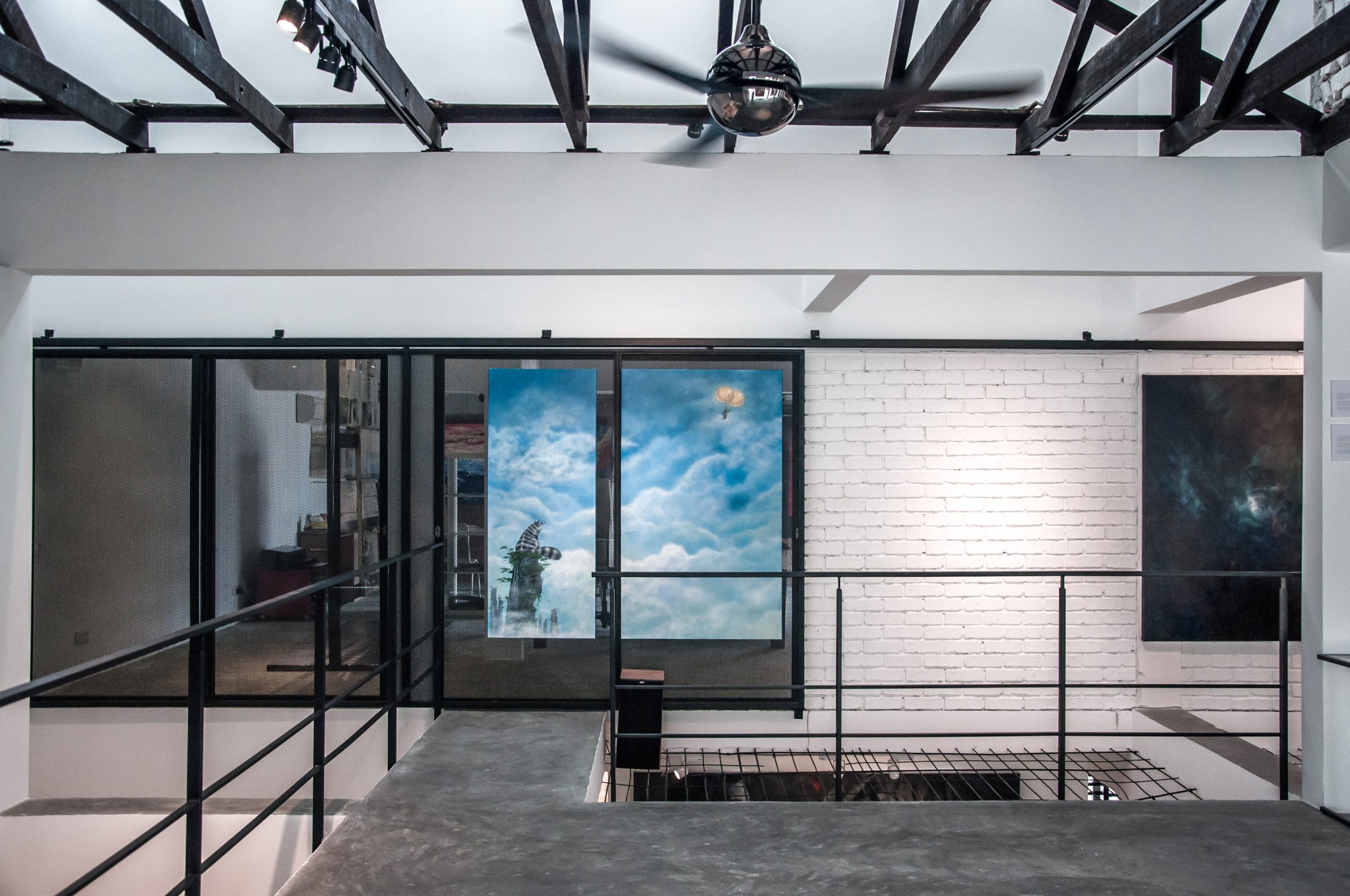 The entire 2 storey floor space was stripped down to its core structure including the partition walls that separated the two units, creating a refreshingly new open plan space. Selective upper floor slabs were then punched through creating voids around, allowing the natural light to reach the lower floor and interestingly turning the upper floor into a suspended platform, a space of striking contrast to its lower floor. “Taking the design of art gallery space to another level, I wanted to create 2 different spaces for the ultimate art experience; an atmospheric art museum for the lower floor posing a more conventional approach where the viewers can be comfortably indulging in the art on the walls; whilst the upper floor space acts as a floating stage where the art viewers are enveloped by the art that surrounds them, duly inevitably interacting and communicating with the art” said the design architect Chun. “It is utterly important that Contemporary Art is not for mere viewing, but to speak, interact and interpreted accordingly. In the absence of this element, contemporary art would be meaningless. Thus I perceive the contemporary art experience as thoroughly exciting unlike any other; as viewers become active participants engulfed in their interaction and experience of the surrounding artworks in this elevated space….inadvertently and inconspicuously an Art Installation in its own essence, coming alive on ‘stage’.”