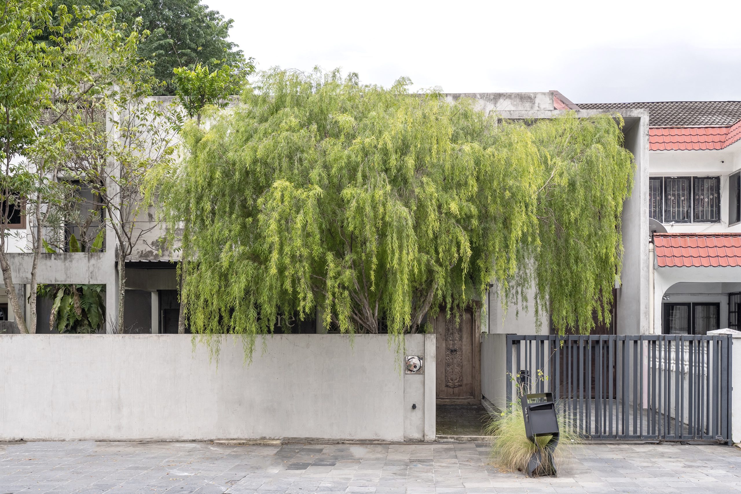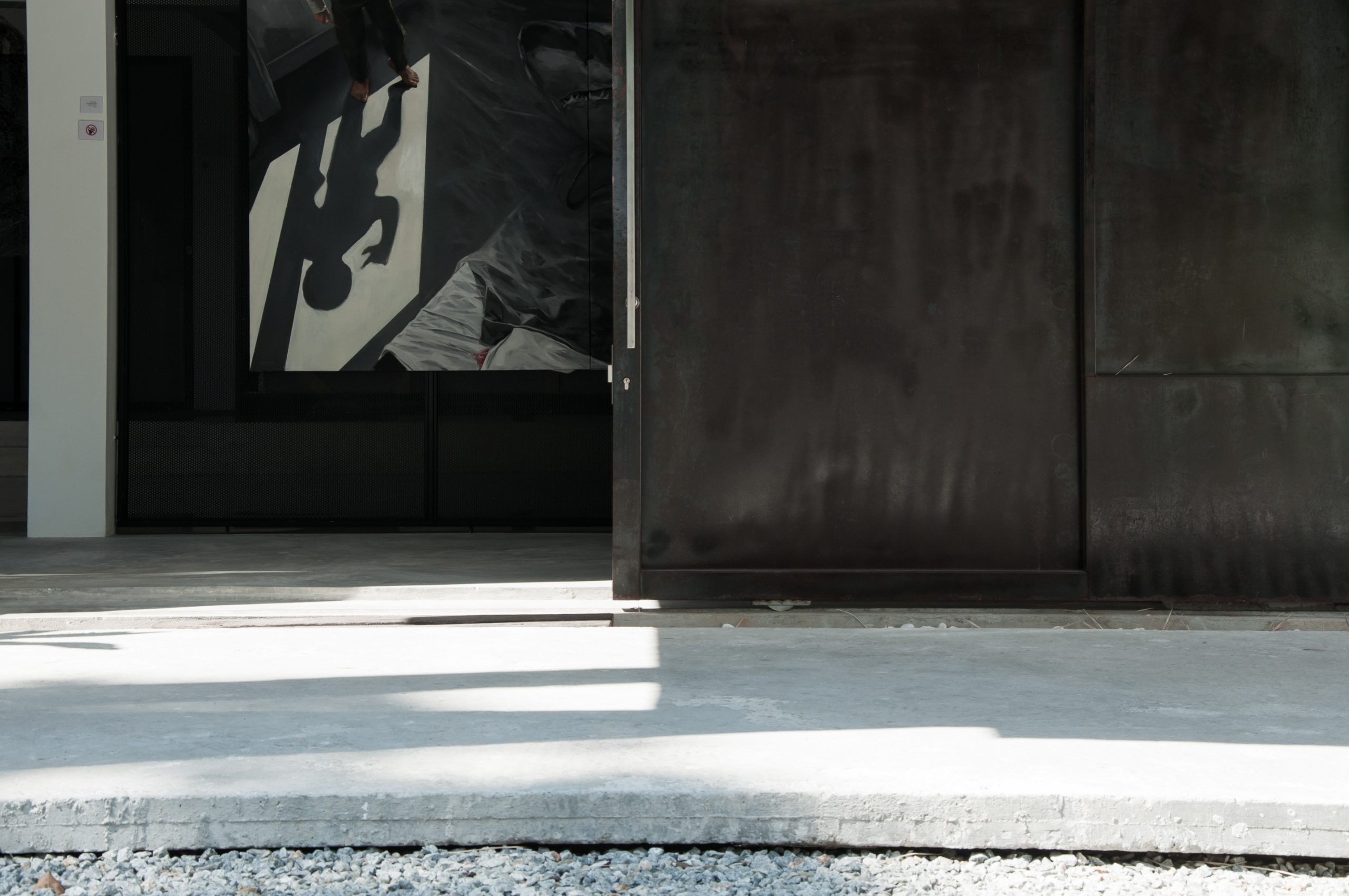 Externally a suspended plain facade wall was added, set 3 feet away from the main building, allowing indirect sunlight to flood the internal space. The new facade wall spans through the now merged 2 units, standing on the existing car porch structure. Concurrently, the two existing car porch structure have since turned into a feature to the overall composition of the facade. Both the facade wall and the two rusty gun metal doors are not merely for the visual composition but also functionally important, as it functions as a sound barrier from the nuisance traffic noise drawing serenity and tranquility to the internal spaces, while provide logistics flexibility for the artworks.