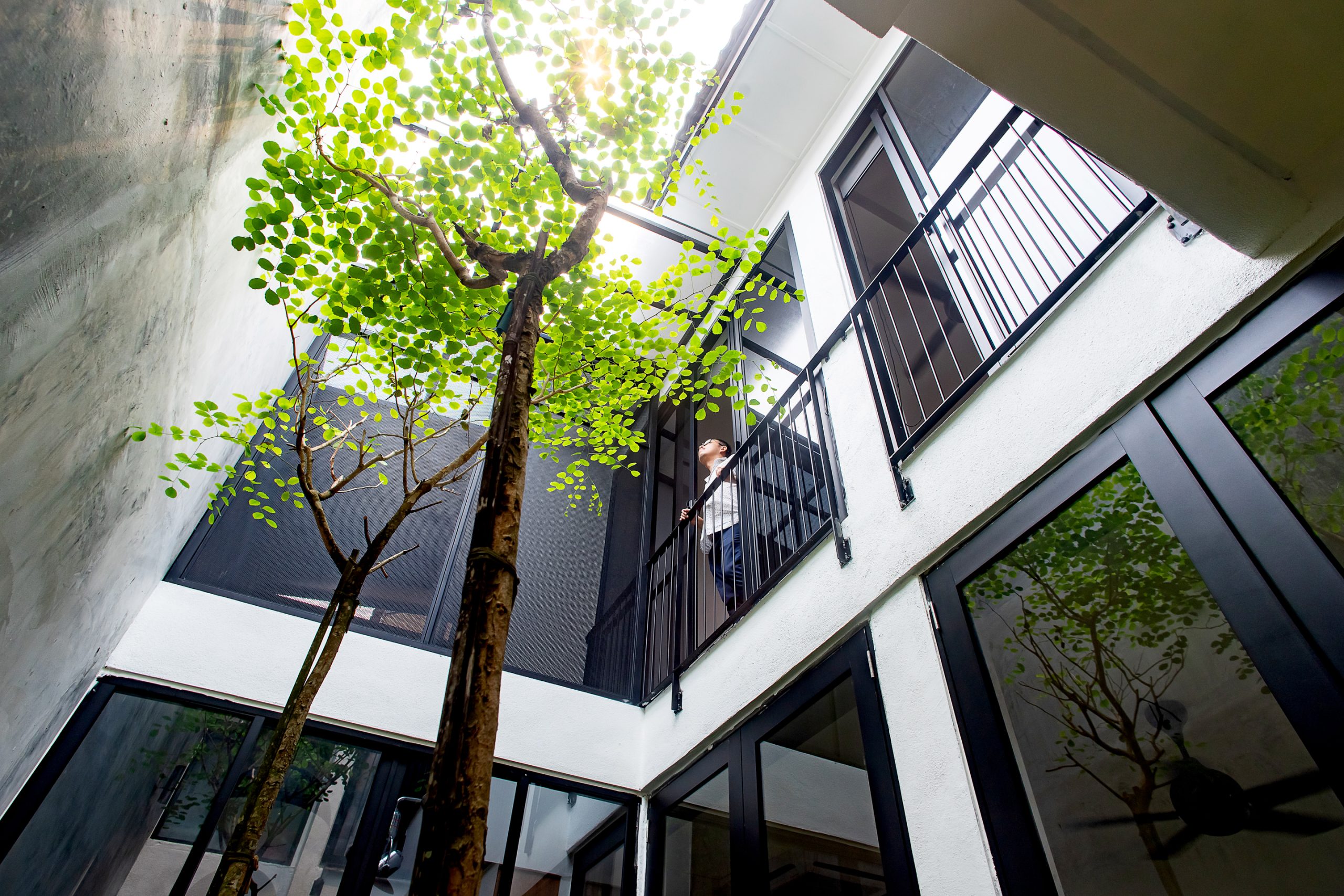 A double height volume is introduced at the middle front, acting as a link between two joint houses, a penetrator between the two floors. With the 2-storey height glass facade, it floods the entire internal spaces with natural daylight and unmutes conversation between families by encouraging inter-spatial communication to the occupants.