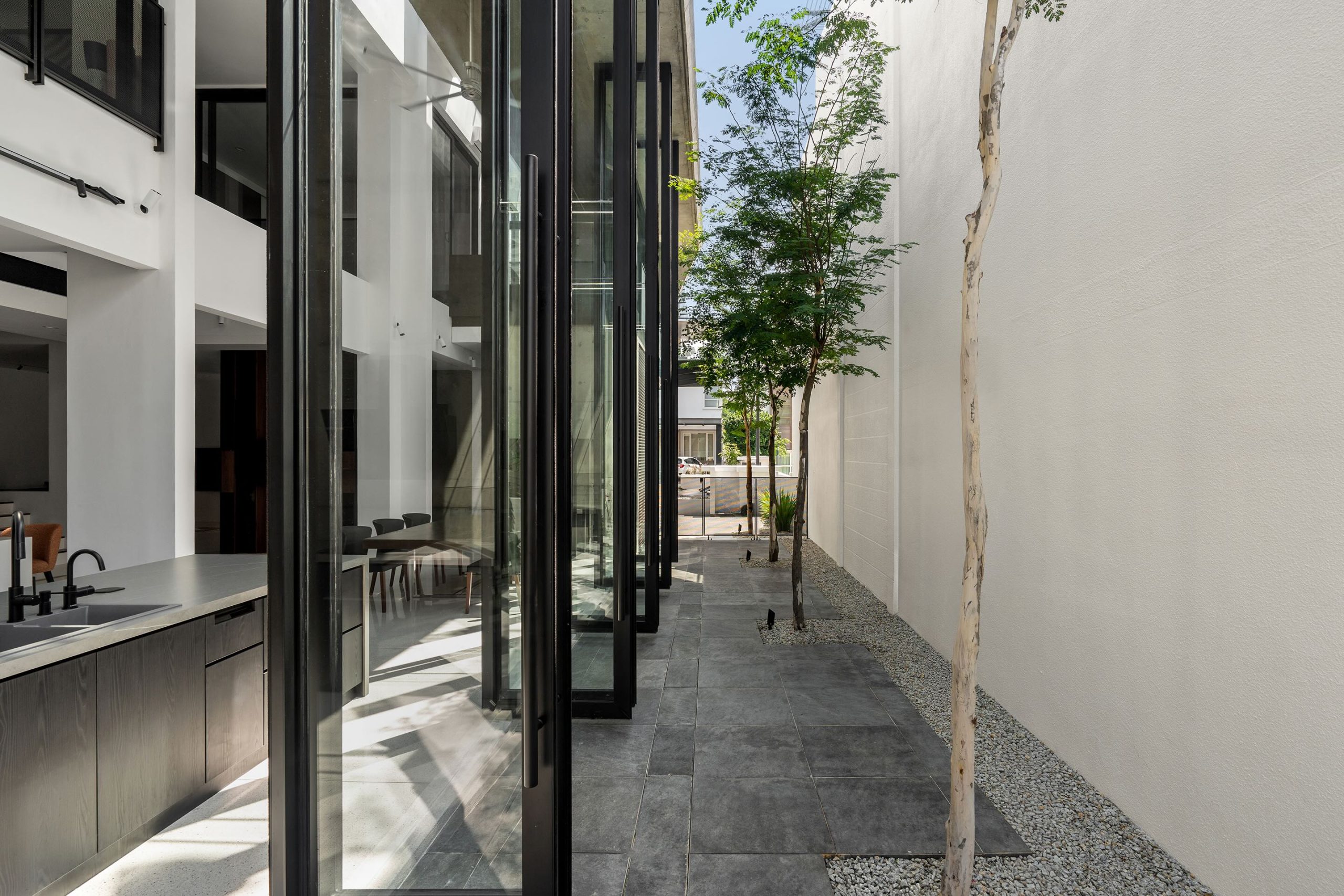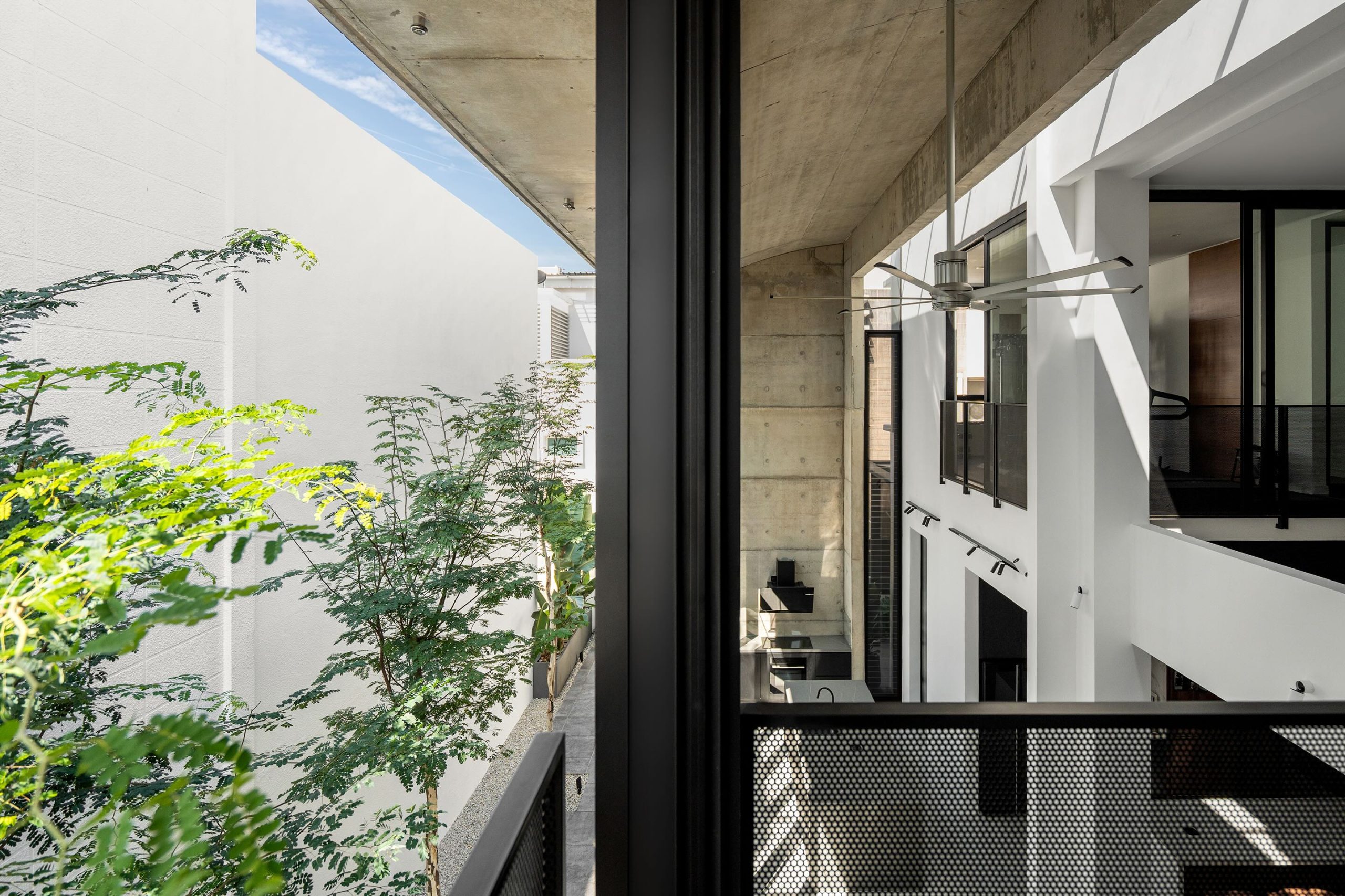 Rather than attaching a conventional extension, Core Design Workshop introduced a new off-form concrete structure positioned deliberately 600 millimetres away from the existing house. This narrow separation forms a glazed and louvred void that functions as a spatial hinge, allowing light, air and movement to pass continuously between old and new. The project’s defining element is therefore not the building itself, but the interface created by proximity without physical attachment.