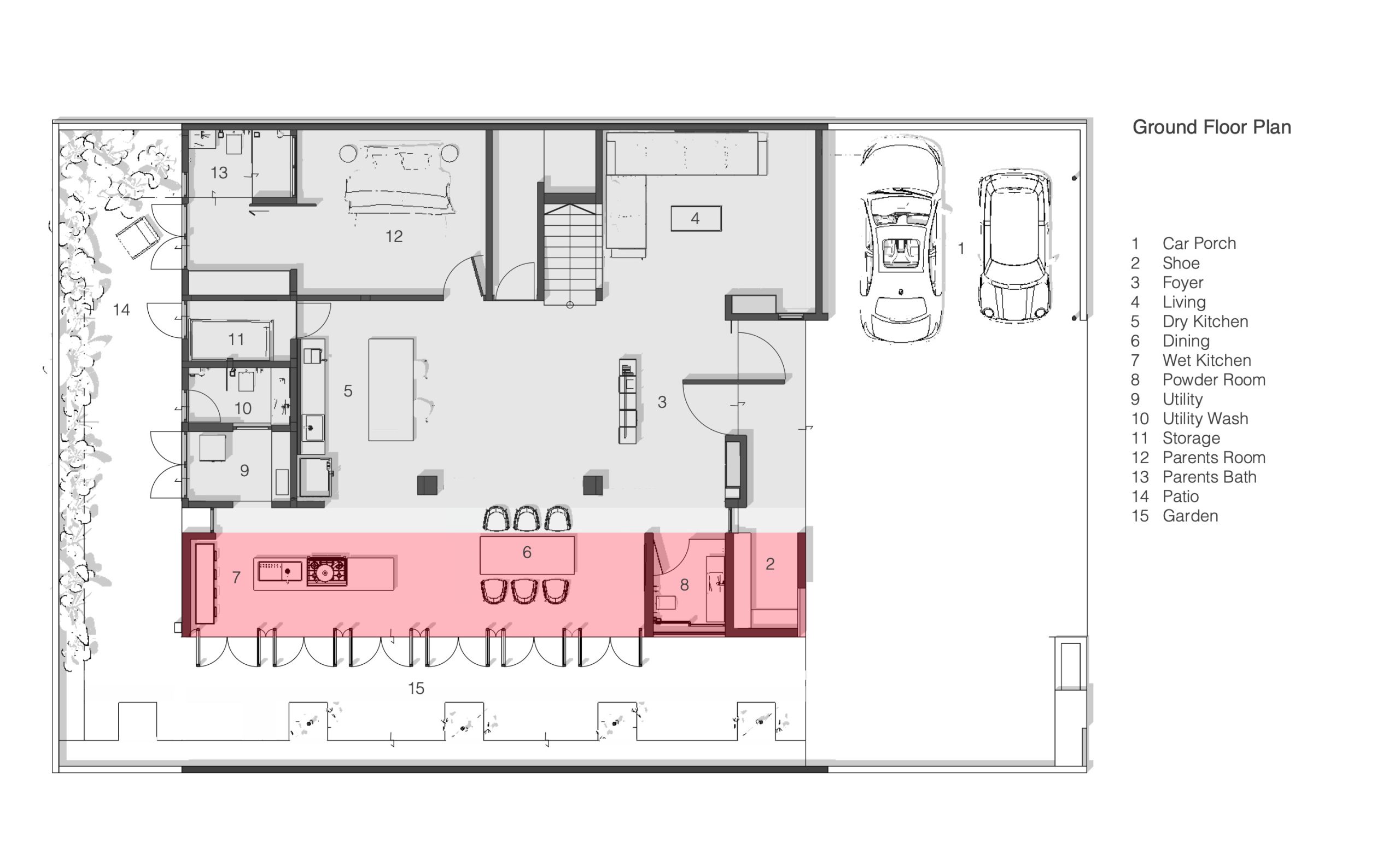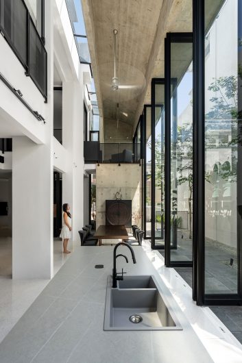 加建部分是一个通高两用的大厅,容纳了用餐和湿厨房功能, 这些 traditionally 被置于马来西亚住宅后部的功能。沿着花园边界,设置了十二扇通高的旋转玻璃门,让空间能够根据需求调整其开放程度。当玻璃门完全打开时,大厅便消融于景观之中;关闭时,空间在保持视觉通透的同时,又能抵御热带风雨。这个半室外大厅被上层空间俯瞰,成为了整栋房子的社交核心。