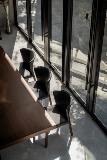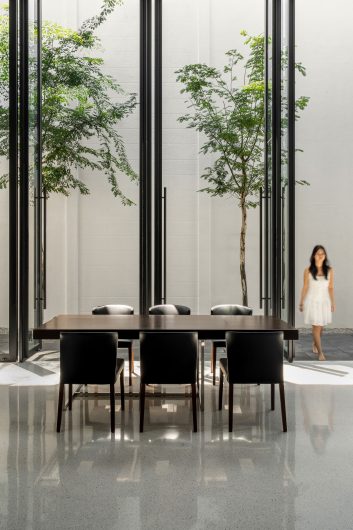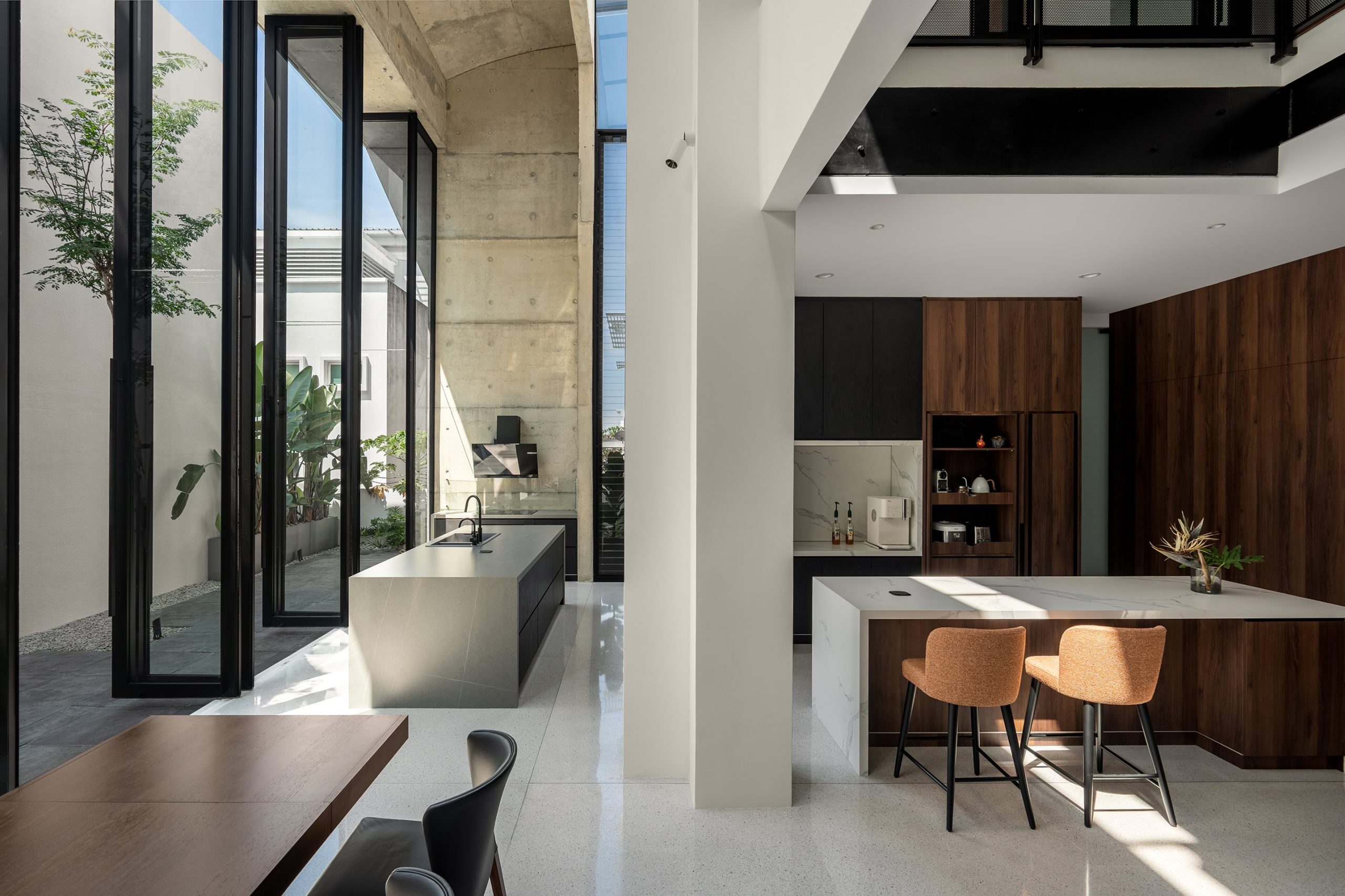 The extension takes the form of a double-height hall that accommodates dining and wet kitchen functions, programs traditionally pushed to the rear of Malaysian houses. Twelve full-height pivoting glass panels line the garden edge, allowing the space to operate across varying degrees of openness. When opened, the hall dissolves into the landscape; when closed, it remains visually continuous while protected from tropical rain. Overlooked by the upper floors, this semi-outdoor hall becomes the social heart of the house.