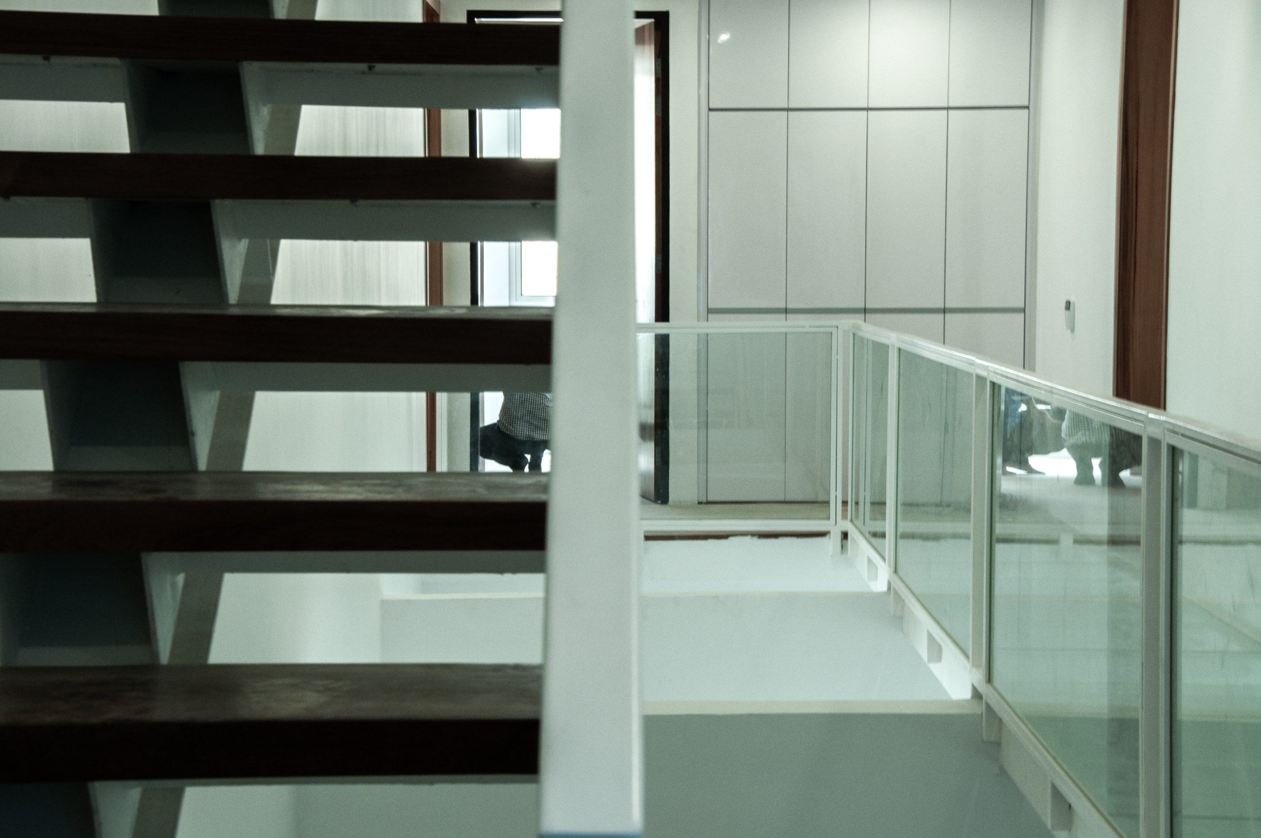 The original houses were stripped off from all the internal walls, staircases to part of the upper floor slab in the centre of the house exposing the existing structural beams. An atrium space in the centre of the house were then created where a dry kitchen island bar and a free standing steel staircase are inserted; with all the functional spaces or rooms organised around, making it the core of the house where all occupants would meet and gather at any given time.