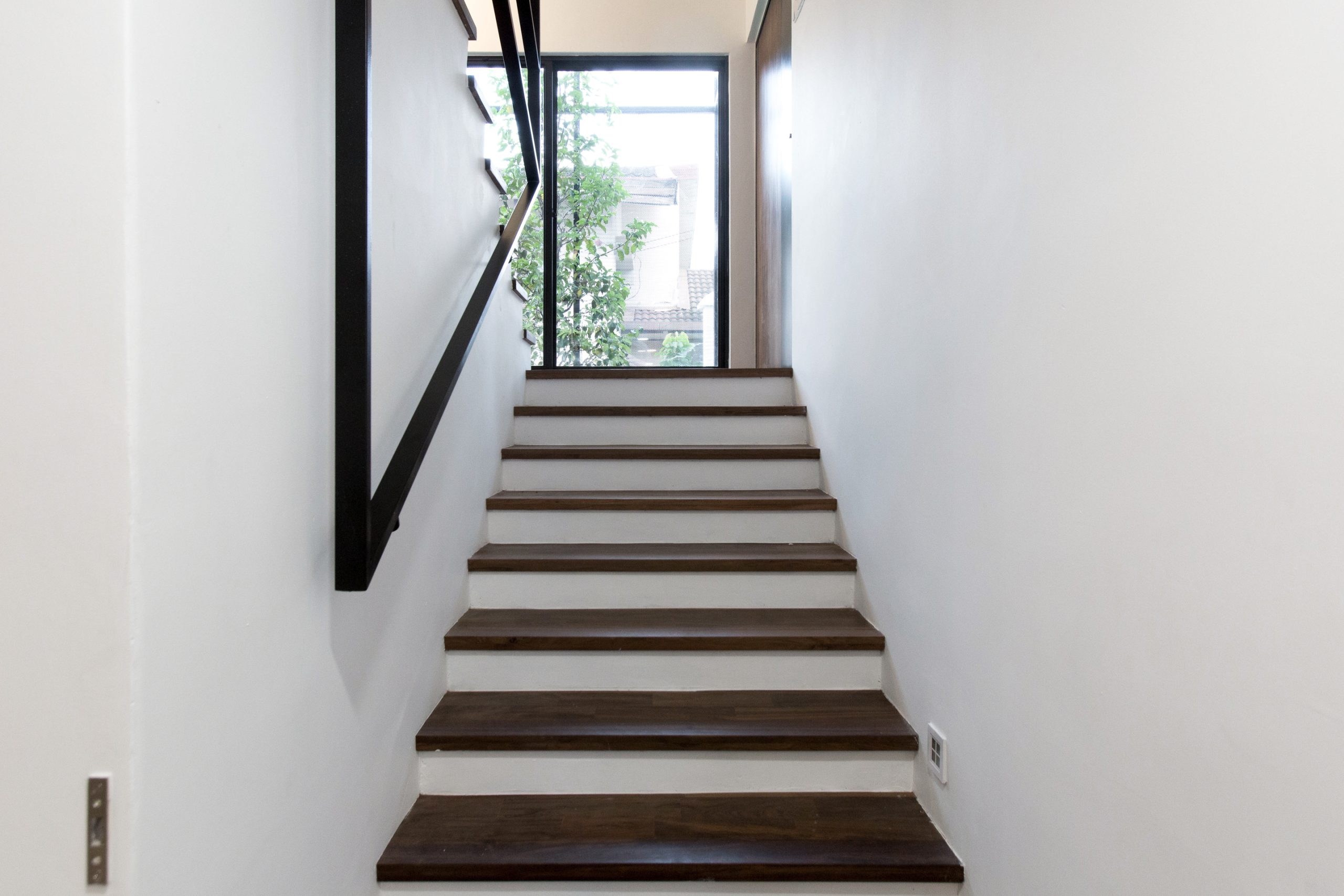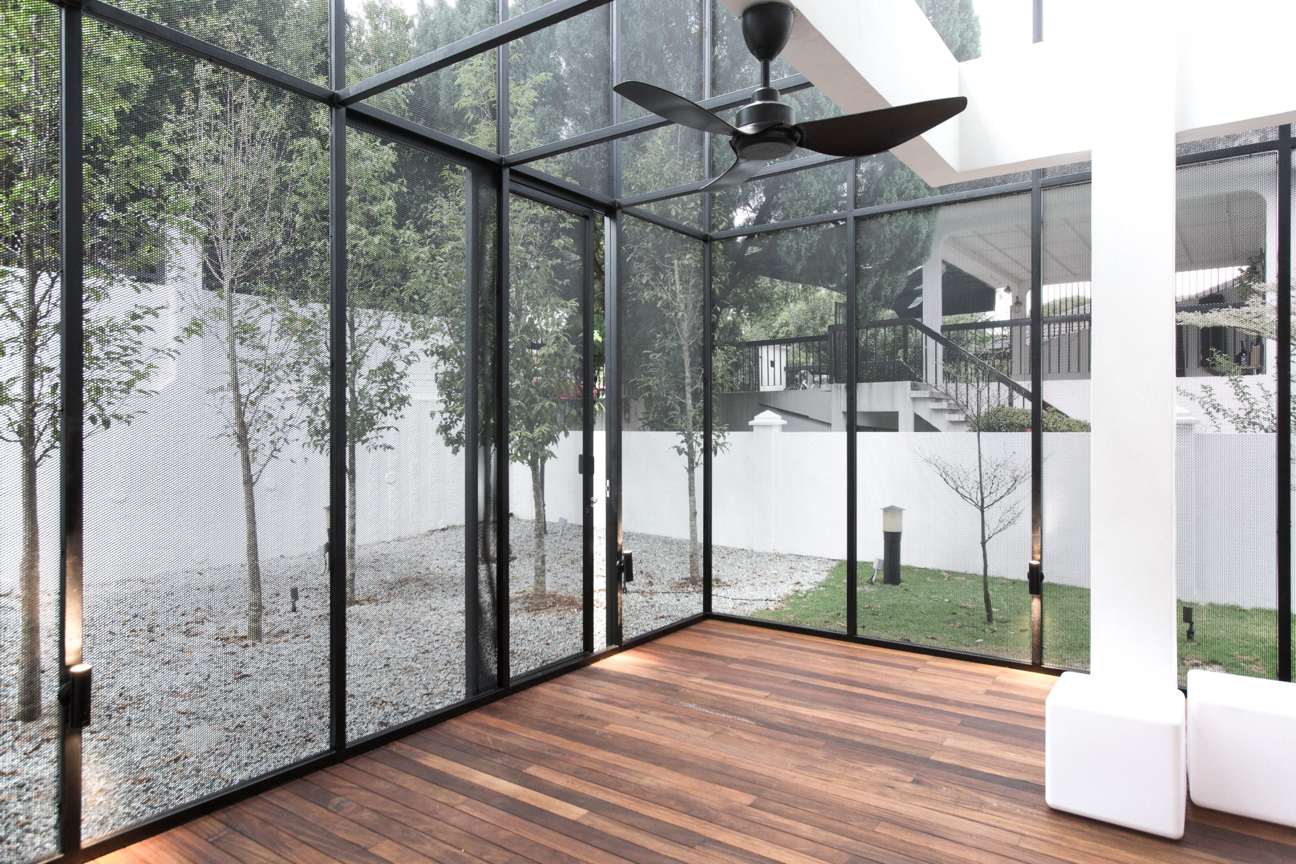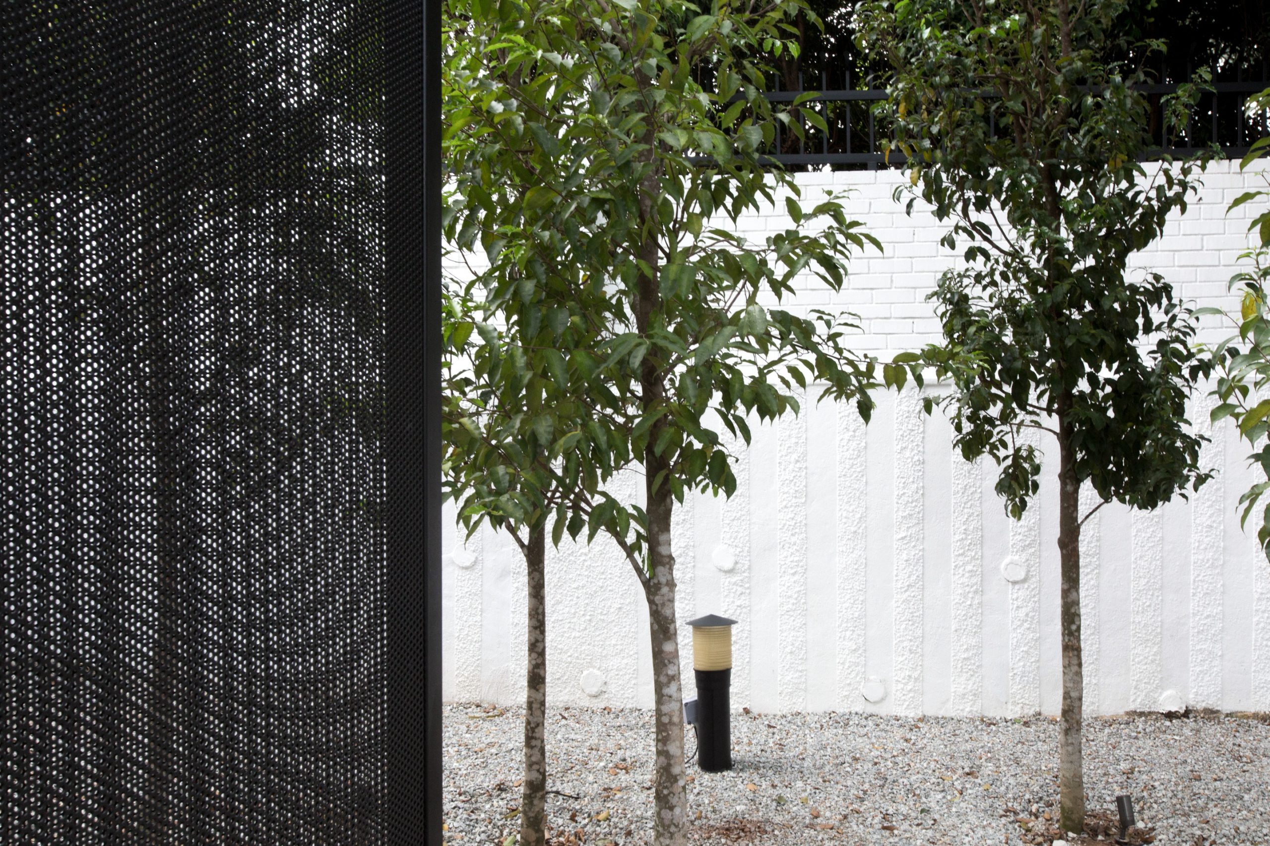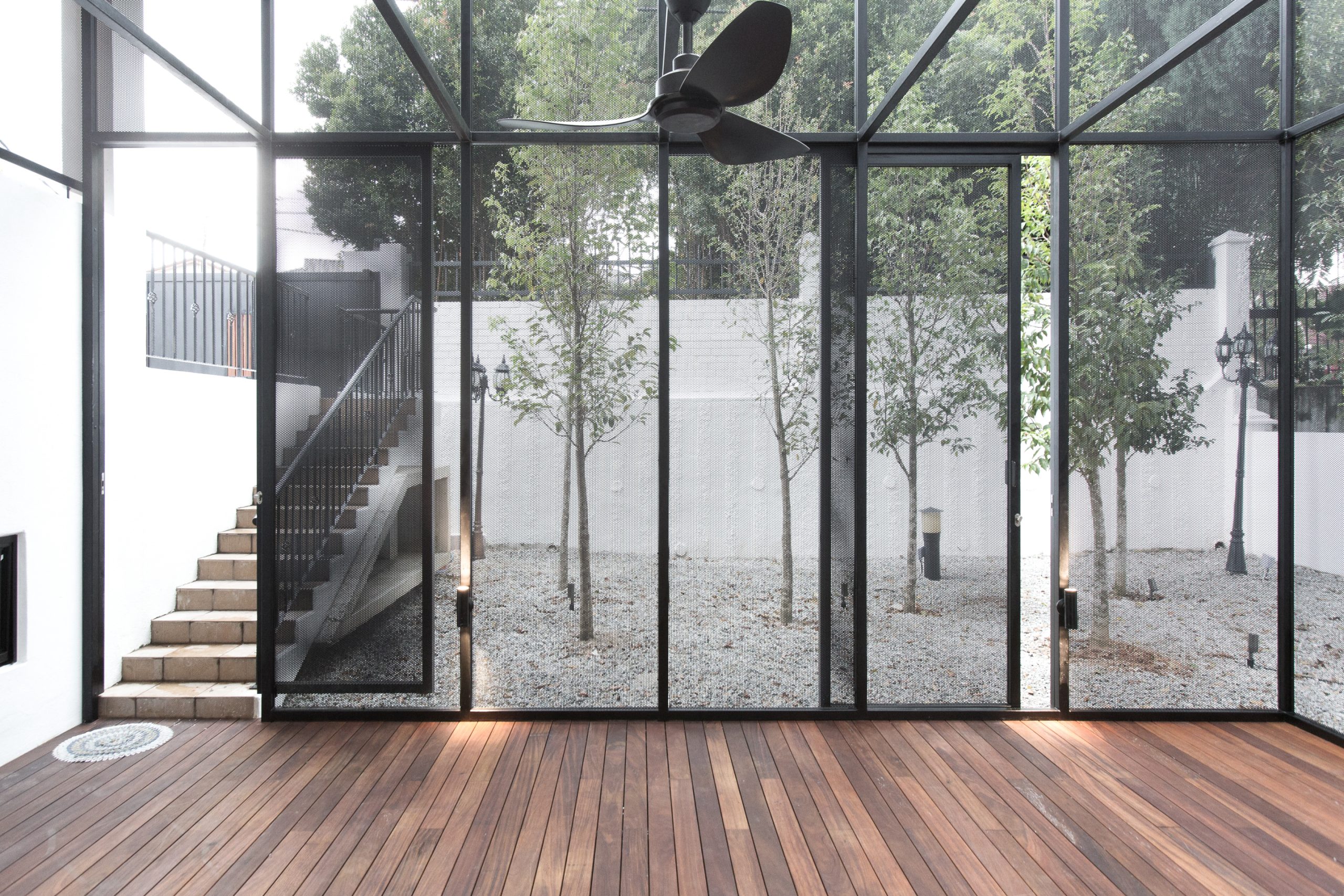 On the stairwell, one South facing wall was taken down to allow maximum lights in and view out, yet on the outside attaching a small perforated steel mesh caged tree-yard providing privacy and security.
