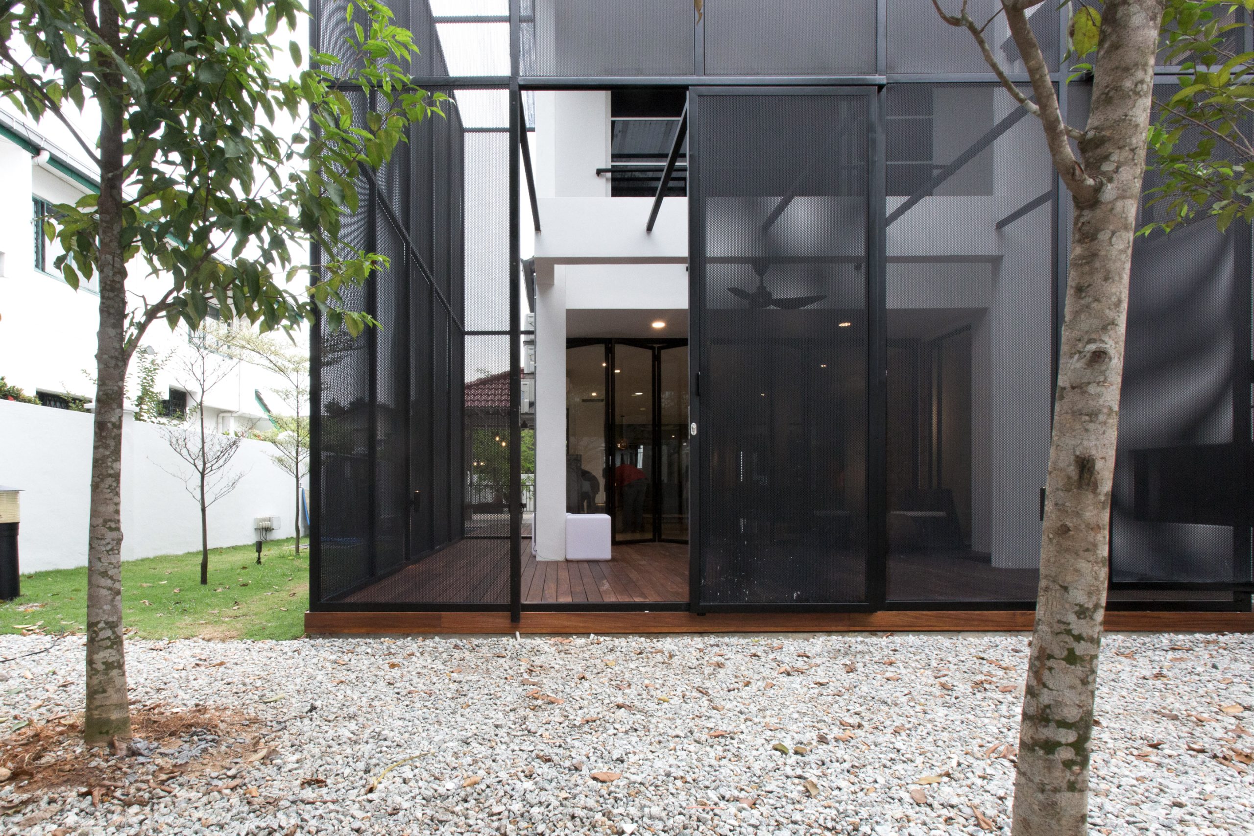 3 main areas were selected to be remodelled; the Living/ Dining, the Entrance Stairwell and the Basement. Adjacent to the existing Living, a new double volume ‘Serambi’ with a perforated steel mesh cage was introduced to screen off the afternoon western sun and also to create a new semi outdoor activity space for the family.