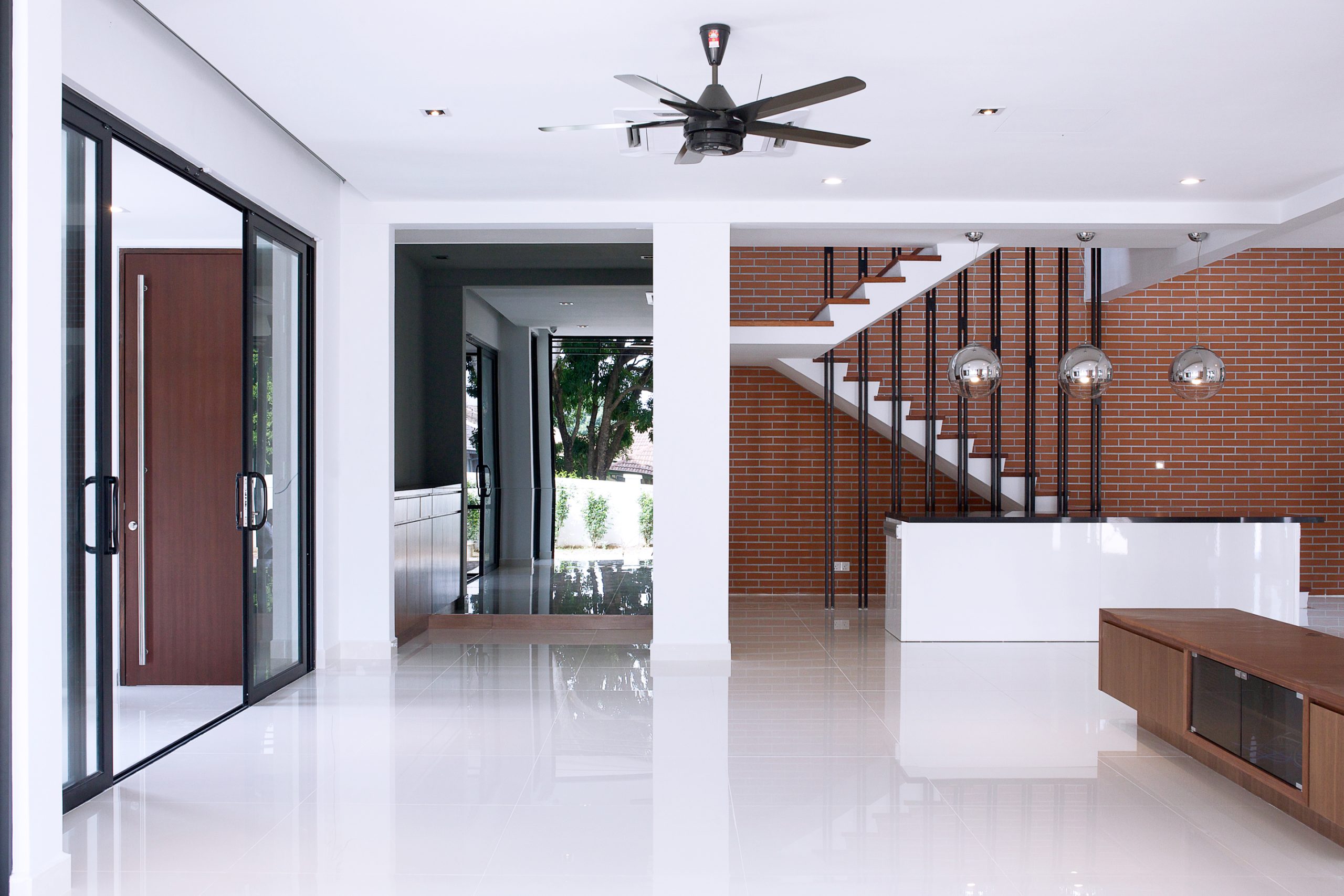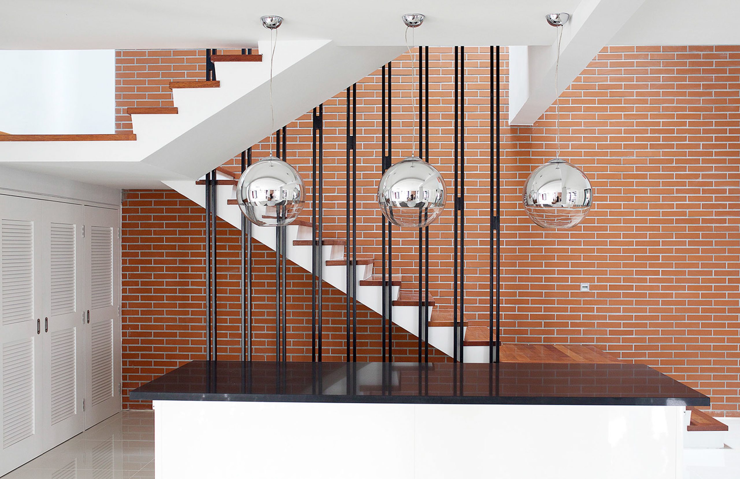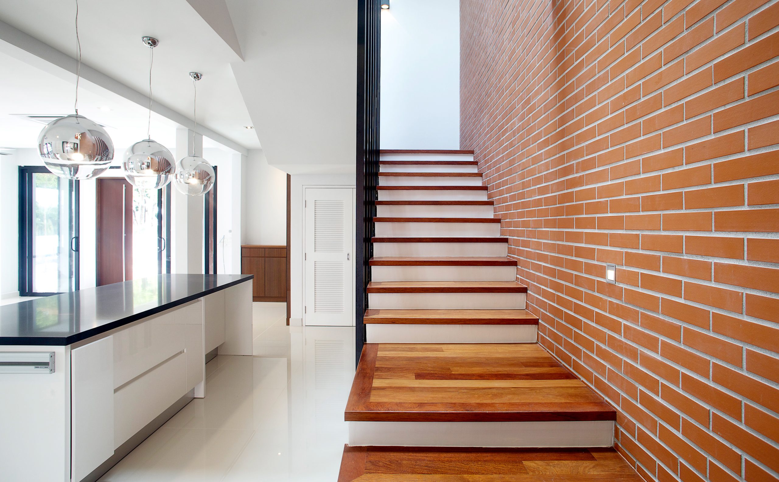 The internal walls within the house were stripped off to the minimal allowing outdoor environment to filter in to most parts of the house. On the other side, in responding to the glass openings on East facade, a skylight was introduced above the newly configured stairwell on the west side of the house, allowing daylight to wash down the double height brick clad parti wall, as like an artwork canvas responding to the greeneries around the house.